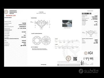 Diamante Naturale 1.00 ct - Colore F - VVS1 - Certificato IGI (Sigillato) Descrizione: Splendido Diamante Naturale da 1.00 Carato, ideale per investimento o per la realizzazione di un solitario di altissimo prestigio. La pietra è accompagnata da certificazione internazionale IGI (International Gemological Institute), il massimo standard di garanzia globale. Caratteristiche Principali: Peso: 1.00 Carato (Pietra importante) Colore: F (Bianco Extra Superiore - Rarissimo) Purezza: VVS1 (Very Very Slightly Included - Grado di purezza altissimo, imperfezioni invisibili anche a 10 ingrandimenti) Fluorescenza: NULLA (None - Caratteristica fondamentale per la brillantezza) Certificazione: IGI (Incisione laser del numero di serie sulla pietra per massima sicurezza) Stato: Sigillato in blister originale e mai aperto. Dettagli aggiuntivi: La pietra presenta proporzioni generose che ne esaltano la presenza visiva. Grazie alla purezza VVS1, la luce attraversa il cristallo in modo limpido e cristallino. ✅ Prezzo di realizzo: 3.650 € (Notevole risparmio rispetto al listino di gioielleria). 📦 Spedizione: Si predilige lo scambio a mano in zona Ragusa/Vittoria presso luogo sicuro (banca o gioielleria di fiducia) per verifica reciproca. Disponibile a spedizione assicurata previo bonifico. Astenersi perditempo o offerte ridicole. Massima serietà.