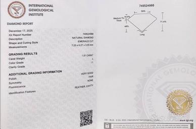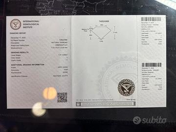 💎 Diamante Naturale 1.01 Carati - Taglio Smeraldo (Emerald Cut) - Certificato IGI In vendita splendido diamante naturale al 100% (non sintetico, non trattato), sigillato nel blister originale e accompagnato da certificato internazionale IGI (International Gemological Institute) n. 749524966. Questo diamante è l’ideale per chi cerca l’importante soglia del carato pieno con il fascino senza tempo del taglio a smeraldo, perfetto per un anello solitario o un ciondolo. 📝 Specifiche Tecniche (Dettagli Certificato): • Peso: 1.01 Carati (Carat Weight) • Taglio: Emerald Cut (Taglio Smeraldo) • Colore: L (Faint Yellow) - si sposa magnificamente con montature in oro giallo o rosa • Purezza: I1 (Inclusioni visibili che ne garantiscono l’autenticità naturale) • Misure: 7.23 x 4.27 x 3.05 mm • Fluorescenza: Nulla (None) - Massima trasparenza senza aloni lattiginosi • Politura: Very Good • Simmetria: Fair