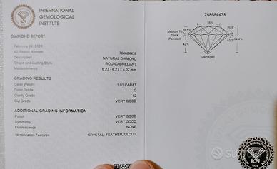 Vendo splendido diamante naturale da 1.01 carati, taglio rotondo brillante, il più ricercato per brillantezza e refrazione della luce. Pietra con ottima presenza visiva e dimensione superiore al carato, ideale per: - Anello di fidanzamento; - gioiello personalizzato; - accessorio di valore; - investimento. Il taglio brillante rotondo garantisce massima luce e scintillio, rendendo il diamante molto elegante una volta montato. Vendo con confezione sigillata e certificato gemmologico. Prezzo richiesto 1050€ poco trattabili. Possibilità di consegna a mano (in un raggio di 100km) o con spedizione assicurata. Contattami per ulteriori informazioni.