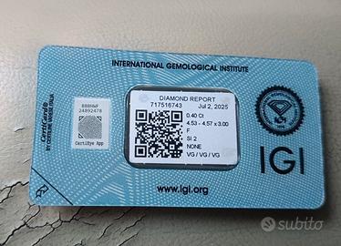 Diamante ben proporzionato, luminoso, con certificato IGI originale.