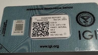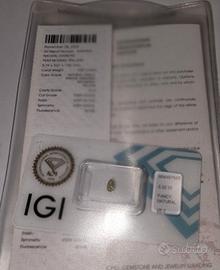 Diamante naturale a forma di pera modificato brillante, colore giallo, VS2, carati 0,22, 3 very good, venduto in blister confezione originale e con certificato IGI ( International Gemological Institute) controllato in laboratorio, spedizione veloce e sicura