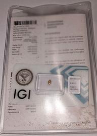 Diamante brillante a forma di pera, colore giallo, carati 0,21, Natural fancy intense brownish, I1; 3 very good, venduto in blister confezione originale, con certificato IGI ( International Gemological Institute)