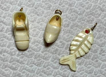 Dieci ciondoli in osso per bracciale charm, varie forme. Sette di questi hanno la biglierina in argento titolo 800.