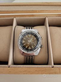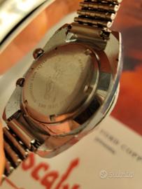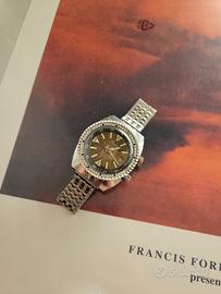 Vendo orologio Dimetron vintage Modello Diver doppia corona by Sicura (stile Supercompressor) Movimento meccanico a carica manuale 17 jewels Quadrante con patina "tropic" marrone uniforme Ghiera interna girevole tramite corona a ore 2 Cassa cromata con fondello in acciaio serrato a vite Bracciale in acciaio maglia Milano/chicco di riso.