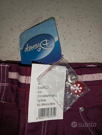 Taglia: XL - 36 Mesi (98 cm). Colore: Bordeaux scuro, con fasce laterali chiare e cuciture a vista bianche. Dettagli unici: Bottoni e tasche cargo laterali decorate con ricami a Fiocco di Neve richiamando il mondo di Frozen / Elsa..
