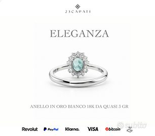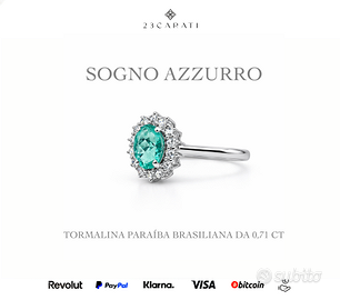 Un gioiello raro e magnetico, dominato da una tormalina Paraíba naturale brasiliana da 0,71 ct, dal colore blu-verde elettrico intenso e luminosità eccezionale, circondata da 14 diamanti naturali per un totale di 0,23 ct, che amplificano la brillantezza e l’impatto visivo.