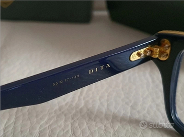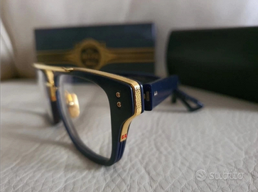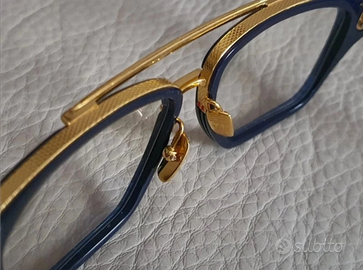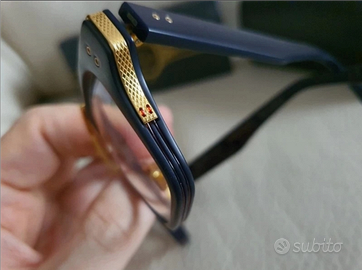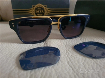 Occhiali da sole Dita rigorosamente originali in celluloide blu e dettagli laminati oro giallo 22k , indossati solo per un servizio fotografico. Doppio set di lenti, uno di lenti fotocromatiche antiriflesso non graduate transition 8 ( costo delle sole lenti 210 euro, scuriscono al sole all' 80% in pochi secondi) più quello di lenti originali specchiate. Pagati in boutique 1300 euro, introvabili full set compreso cofanetto in pelle rigido, e controscatolo.