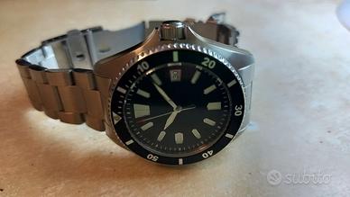 Vendo orologio in acciaio stile diver, 43mm, subacqueo con resistenza fino a 200m, movimento automatico seiko nh35, lunetta girevole, corona e fondello a vite, indice e sfere luminescenti, made in germany.