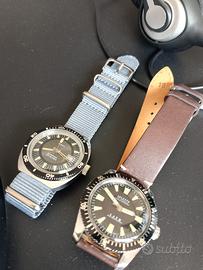 Vendo accoppiati!!! Swiss made a carica manuale Timex a carica manuale, due diver con fascino vintage..... Entrambi 36 mm corona inclusa cinturino nuovo, orologio in buone condizioni, il Timex necessita di una controllata perché ogni tanto si ferma, l altro è in ottime condizioni di marcia. 100 euro NON TRATTABILI GRAZIE
