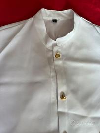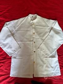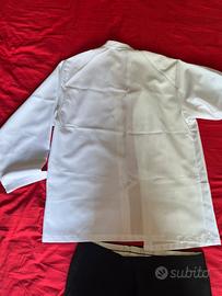 Giacca Bianca taglia L e pantalone nero taglia 52, da utilizzare per divisa cameriere sala scuola alberghiera.