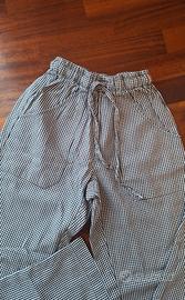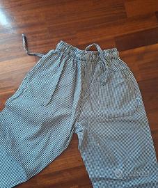un paio di pantaloni da lavoro unisex a fantasia pied de poule del marchio Isacco e una giacca da cuoco classica a doppio petto, caratterizzata da bottoni rossi e profili rossi sui bordi.