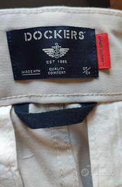 DOCKERS mod. California Khaki Smart 360 flex, colore beige chiaro, nuovi. Caratteristiche del capo: vestibilità: eccezionalmente confortevole taglia 30 slim fit (cfr misure dettagliate) tessuto: cotone 94 % elastane 6 % tasche: laterali a filo, tasca sinistra con taschino interno protetto da cerniera, tasca posteriore destra protetta da cerniera, taschino frontale a destra. Dettaglio misure in centimetri: lunghezza totale 103 lunghezza sotto cavallo 77 circonferenza cintola 80; profilo bordo inferiore 18; Condizioni: NUOVI. No difetti, no macchie. Disponibile a fornire ulteriori dati, foto, misure etc.