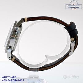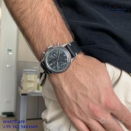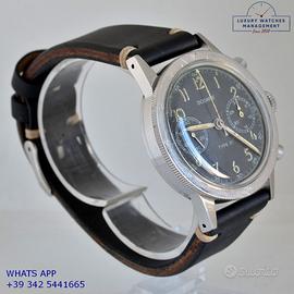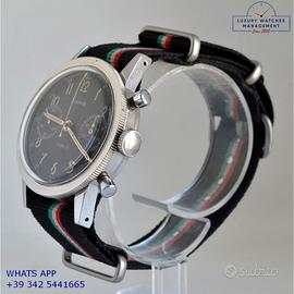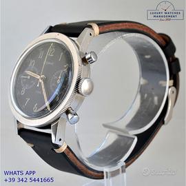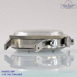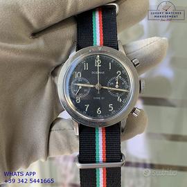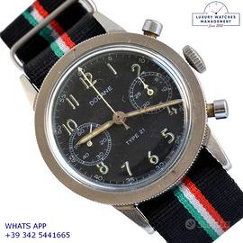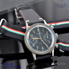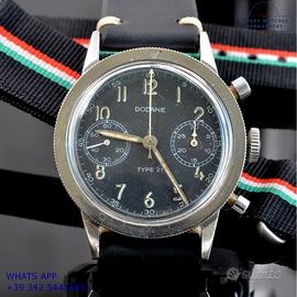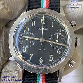 Dodane Type 21 cronografo Flyback dell’Aeronautica Militare Francese in acciaio, anno di produzione 1964, ghiera acciaio bidirezionale a scala graduata, vetro plastica a cupola, quadrante colore nero opaco a due contatori orizzontali con indici arabi e sfere al trizio originale dell’epoca mai ritoccato o ristampato, movimento meccanico a carica manuale funzione Flyback, cinturino vintage in pelle di vitello colore nero con fibbia acciaio generico, più altro cinturino modello Nato in tessuto colore nero a tre colori con fibbia acciaio generica.