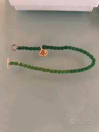Bracciale mini granelli in plastica riciclata verde, catenina in acciaio, anello brisè e piastrina, barretta a T in argento e piastrina in argento e smalto verde