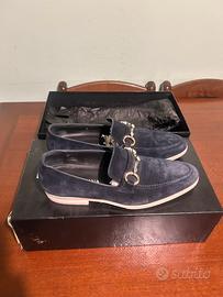 Vendo mocassini originali Dolce & Gabbana in pelle scamosciata blu, modello elegante con morsetto metallico dorato.