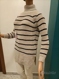 Dolcevita donna a righe lungo, con spacchi laterali, colore crema/beige, 100% acrilico. Taglia unica (S/M). Misure circa: Spalle 42 Cm - Torace 45 Cm - Maniche 47 Cm - Lunghezza 68 Cm. Video articolo e altri articoli disponibili sul profilo Facebook 2EFFEMOD