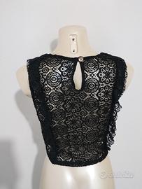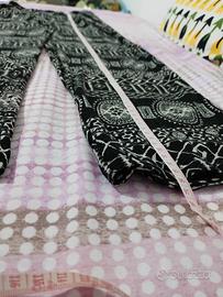 Doppio outfit composto da: - Pantaloni fantasia africana elasticizzati e attillati con elastico in vita - Top corto in pizzo nero con inserti smerlati - Canotta semplice di colore nero Pantaloni Taglia S Top taglia S/M Canotta taglia S/M Non esitate a chiedere per ulteriori foto o informazioni.