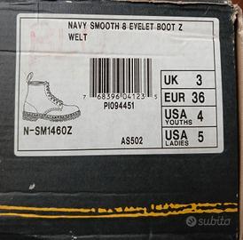 Dr Martens blu navy liscio a 8 occhielli taglia Eur 36. Con scatola originale, ottimo stato della suola e dell'interno. Qualche graffio come in foto.