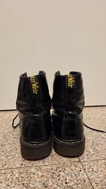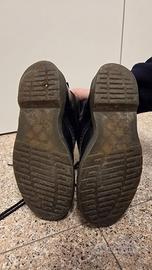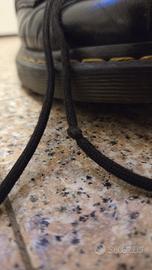 Dr. Martens classiche nere a 8 buchi (stile 1460). Anfibi neri in stile classico. Anfibi di pelle liscia nera, con finitura leggermente lucida. Modello alla caviglia con lacci frontali e tirante posteriore per facilitare la calzata. Suola spessa e robusta, in gomma, con cucitura a vista color giallo lungo il bordo. Leggermente spellate sopra la punta della scarpa destra come si può vedere nella foto. Piccolo nodo su un laccio ma non complica l’allacciatura. Sono state indossate parecchio ma si trovano in buone condizioni.
