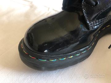 Dr. Martens nero lucido, con cuciture color arcobaleno. Indossati una sola volta a causa di numero errato. Presentano comunque qualche graffio sulla punta (vedi foto) e un’etichetta è stata tagliata.
