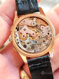 Quadrante: Bellissimo quadrante originale color champagne con indici applicati. Casa placato oro 20 micron. L'orologio è funzionante. La funzione cronografo parte, si ferma e azzera correttamente. Un pezzo di storia dell'orologeria svizzera, perfetto per chi cerca un cronografo vintage elegante e con un movimento meccanico di grande pregio.
