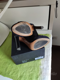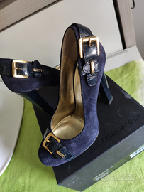 Tg 37. Indossate die volte, camoscio blu e tacco lucido, particolari in oro. Scatola inclusa. Qualche segno sulla suola, in quanto vero cuoio, che può ricoperta da qualunque calzolaio. 500 euro in negozio. Contattatemi se interessati