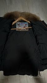 Splendido bomber invernale Dsquared2 originale, un pezzo iconico che unisce lo stile canadese del brand con l'alta manifattura italiana. Caratterizzato dal grande stemma ricamato sulla spalla e dal cappuccio bordato in vera pelliccia.