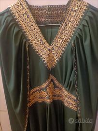 Due bellissimi abiti donna eleganti della Tunisia, lunghi , spalle coperte da mantello , ricamati in oro , taglia 46/48 .Mai usati , Nuovi . Da indossare per stupire ed essere diversi in serate speciali, eventi o per costume di Carnevale. Bellissimi i colori , verde bottiglia e rosso che donano a tutte.Il PREZZO è x Singolo Abito .