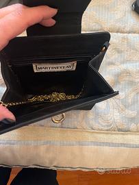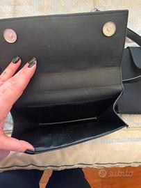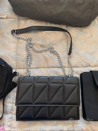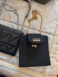 Due borsette nere rigide da sera di cui una con chiusura con clip e tracolla a catena misure 16x16x4 con taschina interna chiudibile con zip mentre un’altra chiudibile con due ciappe e senza alcun scomparto interno con tracolla metà catena e metà ecopelle da poter indossare sia a tracolla che a spalla