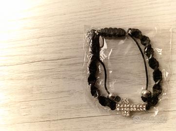 Due Bracciali in tessuto regolabili con croce. Nuovi con bustina.
