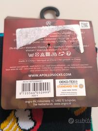 Due calze di Natale da uomo marca Apollo: una con Babbo Natale e una con birre e hamburger con cappello di Babbo Natale. Sotto al piede c'è la scritta Merry Christmas. Vestono dal numero 41 al numero 46.