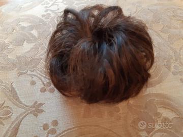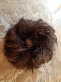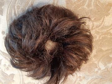 Due elastici con ciocche di capelli sintetici. L’elastico più grande è contornato da capelli di color castano scuro ramato. L’elastico più piccolo ha capelli di color castano scuro.