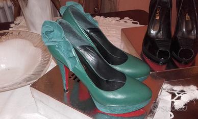 Décolleté verde: pelle e camoscio, con un fiore in pelle sul tallone, altezza tacco 12 cm.
