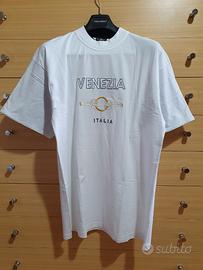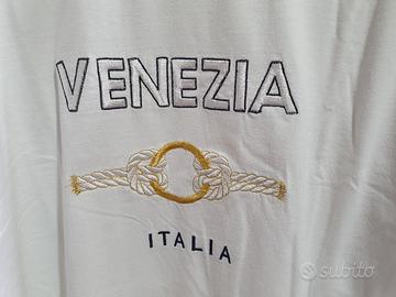 La maglietta di Venezia è bianca, larga 55 cm al spalle e seno e lunga 77 cm. Il risvolto delle maniche è blu con effetto marinaresco.