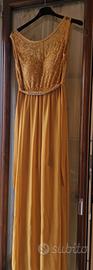 Il vestito senape molto lungo, presenta cintura e il corpetto in pizzo.