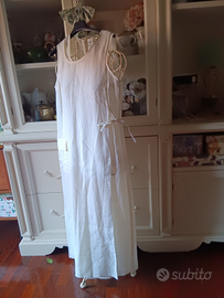 2) Vestito lungo in pregiatissimo lino 100% bianco, marchio stilista Daniela Mazza made in Italy, taglia 42 ma veste bene anche la 44, caratterizzato da due parti del vestito che si incrociano e si sovrappongono formando un abito unico. C'è tanto lino 100% del tipo più pregiato. I due vestiti si indossano l'uno sopra l'altro collegandosi con un nastrino interno ed uno esterno.