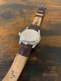 Dufeau Swissair 1931. Cassa acciaio da 36 (esclusa corona, a vite). Fondello a vite raffigurante l’aereo di linea Douglas DC-3. Ghiera zigrinata con puntatore rosso. Sfere e indici al trizio. Movimento a carica automatica. Perfettamente funzionante. Cinturino Hirsch di qualità, personalizzato. Orologio in buone condizioni generali, su vetro e cassa sono presenti segni (vedi foto). Prezzo non trattabile.