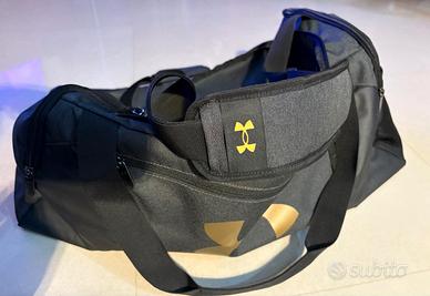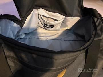 Borsone da palestra/viaggio, ampia apertura anteriore chiusa da cerniera, tasconi laterali, di cui uno chiuso anch'esso da cerniera, ulteriore tasca frontale, portadocumenti all'interno.