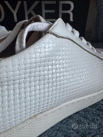 Sneakers in pelle, bianco pulito, lucido, ben tenute, pulite dentro, non puzzano, nessun taglio o rottura, alcune pieghe sulla pelle visibili sulle foto.