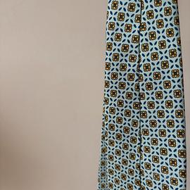 * Fantasia: Micro-pattern geometrico classico con piccoli fiori stilizzati in tonalità oro e marrone su base azzurro polvere e blu navy.