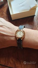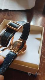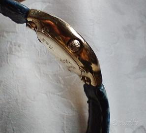 cassa in oro giallo 18kt, fondello serrato con viti, lunetta con piccoli diamanti e rubini, quadrante avorio, numeri romani applicati, movimento al quarzo, cinturino in pelle di lucertola blu, lungh. interna cm 16, chiusura deployant a scomparsa in oro giallo 18kt, marcata Ebel, vetro minerale, gr. 32. Diam. mm 24