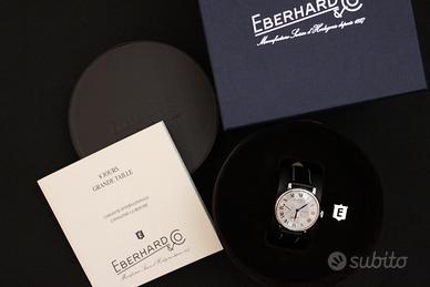 Eberhard 8 jours 21027, a carica manuale e con riserva di carica. Molla di carica a vista sul fondello.Perfettamente funzionate, completamente originale e coevo. Cinturino e fibbia originali, cinturino color nero in pelle. Completo di scatola e garanzia (timbrata).