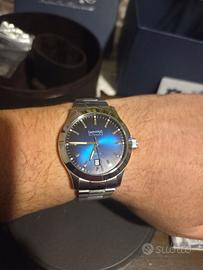 Listino 2.200 euro Orologio Uomo Eberhard & Co. Automatico AIGLON GRANDE TAILLE 41030.09/SE Cassa in Acciaio, Quadrante Blu e Cinturino in Acciaio CARATTERISTICHE TECNICHE: MOVIMENTO AUTOMATICO CASSA IN ACCIAIO MOVIMENTO MECCANICO AUTOMATICO VETRO ZAFFIRO ANTIRIFLESSO INTERNO CORONA A VITE FONDO LUCIDO SERRATO DA 6 VITI CINTURINO CON BRACCIALE CHABLIS IN ACCIAIO FIBBIA IN ACCIAIO E&CO QUADRANTE BLU “dégradé” Diametro: 41 mm Distanza Anse: 20 mm Impermeabilità: 50 m Indici applique Lancette tipo a bâton, luminescenti