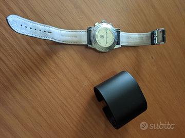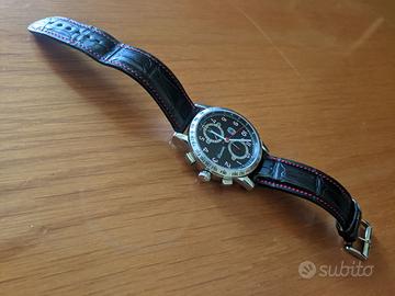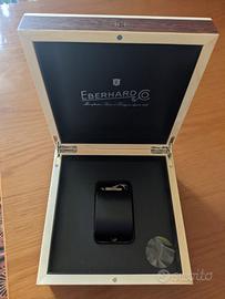 Stupendo cronografo meccanico della Eberhard - Mod. "Tazio Nuvolari Data". Acquistato nuovo da rivenditore ufficiale del marchio in Germania ("Uhrenhandel"), perfetto in ogni suo particolare; usato molto poco a tutela del suo stato. Il quadrante è ovviamente in vetro zaffiro con trattamento antiriflesso sulla supeficie interna - Corona acciaio a vite personalizzata - Fondo serrato da 8 viti personalizzato con lavorazione a "rosette". Corredato da scatola, controscatola, manuale d'uso, prova d'acquisto con data (09/10/2024); ancora in garanzia (scadenza: 09/10/2026). Scritta TN all'interno del carapace bianco. Lunetta in acciaio con lavorazione soleil e scala tachimetrica nera con la scritta “miles per hour” in rosso.