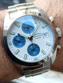 Da Viola Orologi, proponiamo un grande classico dell'orologeria sportiva: l'Eberhard Champion, un cronografo che unisce eleganza tecnica e robustezza, in una configurazione "Panda dial" dal fascino senza tempo. Dettagli dell'Esemplare L’orologio si presenta in ottime condizioni estetiche e meccaniche, pronto per essere indossato. La cassa mantiene linee nitide e il quadrante bianco con contatori blu a contrasto è perfetto, garantendo una leggibilità eccezionale. Movimento: Meccanico a carica automatica (Calibro su base Valjoux 7750, sinonimo di affidabilità). Cassa: Acciaio inossidabile, diametro 40 mm (esclusa corona). Quadrante: Bianco/Argenté con contatori blu e indici luminescenti. Lunetta: In acciaio con scala tachimetrica "Base 1000". Bracciale: Originale in acciaio, completo di tutte le maglie, con chiusura personalizzata Eberhard & Co. Vetro: Zaffiro bombato antigraffio. Condizioni e Corredo Stato: Ottime condizioni generali. Corredo: Solo orologio (senza scatola e garanzia originale). Garanzia Viola Orologi: Viene rilasciata la nostra dichiarazione di vendita e autenticità. PREZZO NON TRATTABILE. Vendita veloce per chi ne approfitta Disponibile presso Viola Orologi Contattaci in DM per ulteriori foto o informazioni.