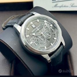 Automatico calibro EB. 251 12 ½” – base ETA 2894-2 con finitura rodiata, decorazioni perlage e viti blu. Cronografo meccanico a carica automatica,