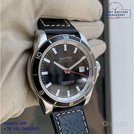 Eberhard & Co Champion V Timeonly acciaio, anno di produzione 2014, ghiera acciaio con inserto alluminio colore nero a scala graduata, vetro zaffiro antiriflesso, quadrante colore nero con data, indici e sfere al LumiNova, movimento meccanico a carica automatica, cinturino in pelle di vitello colore nero con fibbia acciaio originale Eberhard & Co.