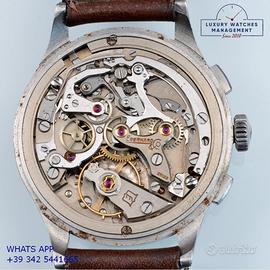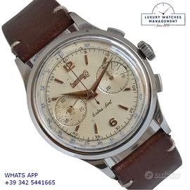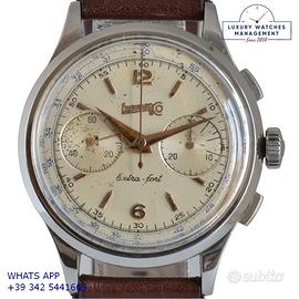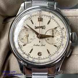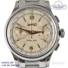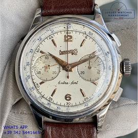 Eberhard & Co Extra-Fort cronografo acciaio, anno di produzione 1950 circa, ghiera acciaio liscia, vetro plastica bombato dell’epoca, quadrante colore avorio a due contatori indici e sfere oro rosa, originale dell’epoca mai ritoccato o ristampato, movimento meccanico a carica manuale, bracciale elastico in acciaio con chiusura deployante originale Eberhard dell'epoca, più altro cinturino generico in pelle di vitello colore marrone con fibbia acciaio.