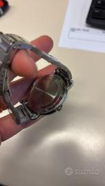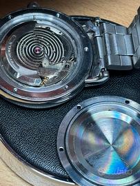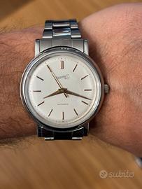 Elegante orologio automatico Eberhard & Co., manifattura svizzera di La Chaux-de-Fonds, presumibilmente risalente agli anni ’60–’70. •Movimento automatico 27 jewels, con rotore firmato Eberhard & Co. •Quadrante argenté con indici batonné in tono oro rosa, lancette dorate •Scritta “Automatic” e “Swiss Made” al quadrante •Diametro cassa: 39,7mm •Cassa in acciaio aftermarket, in buone condizioni generali •Bracciale in acciaio “stainless steel”, probabilmente d’epoca Condizioni: Orologio funzionante. Quadrante con leggeri segni del tempo, coerenti con l’età. Movimento visibile tramite fondello aperto. Storia del marchio: Fondata nel 1887 da Georges-Lucien Eberhard a La Chaux-de-Fonds, in Svizzera, Eberhard & Co. è una delle maison orologiere indipendenti più antiche e rispettate. Pioniera nel campo dei cronografi — fu tra i primissimi a produrre un cronografo da polso a doppio pulsante negli anni ‘30 — il marchio si è distinto nei decenni per l’alto contenuto tecnico e l’eleganza dei propri segnatempo. I modelli automatici degli anni ’60–’70, con i loro quadranti sobri e raffinati, rappresentano oggi oggetti di culto per gli appassionati di orologeria vintage svizzera.