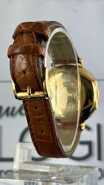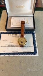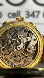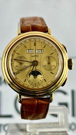Eberhard & Co. Raro cronografo a tripla data e fasi lunari in edizione limitata, oro 18 carati Cassa: cassa originale rotonda in oro massiccio 18 carati, lunetta a gradini, doppio fondello, pulsanti a leva, sede della manifattura di La Chaux-Fonds numero di referenza 32001 Diametro: cassa da 38 mm e altezza 13 mm Movimento: a carica manuale, calibro Valjoux 88 con ruota a colonne, firmato Eberhard Co. Quadrante: quadrante originale in oro con indici applicati in oro, giorni della settimana e mesi a ore 12, tre contatori a ore 3, 6 e 9, fasi lunari a ore 6, indicatore della data. Vetro: vetro di cristallo Fibbia: originale dorata firmata con logo Cinturino: in pregiata pelle nera, larghezza 16 mm, lunghezza 21 cm. Corona: dorata Per favore, guardate le foto: valgono più di mille parole. Tutte le spedizioni sono dotate di numero di tracciamento e assicurazione completa. Eberhard & Co. Raro cronografo Triple Date Moonphase in edizione limitata, GARANZIA 12 MESI MANUEL OROLOGI
